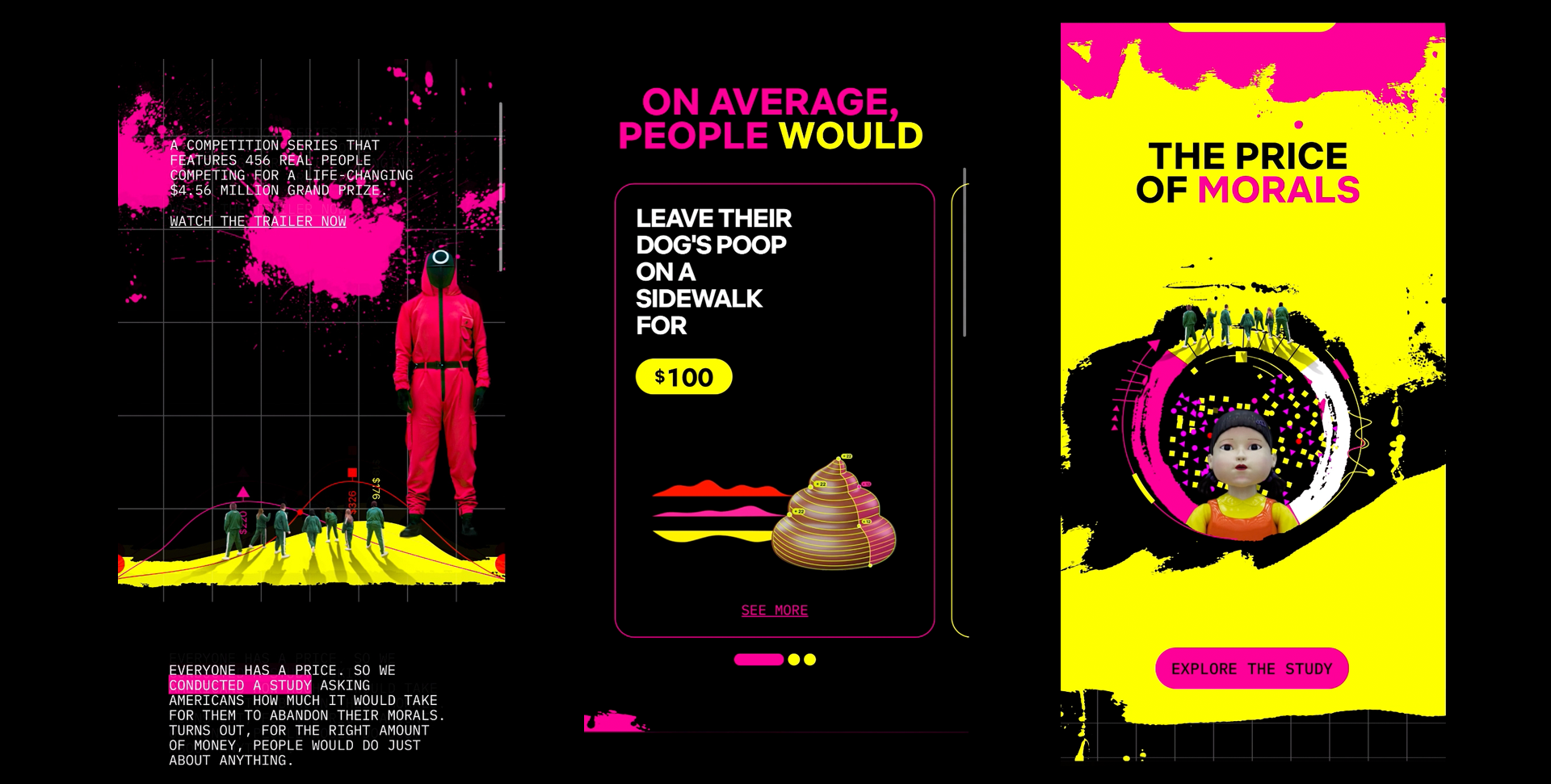 As a Producer at Your Majesty, my contribution on this project involved overseeing the end-to-end production of the interactive microsite for The Price of Morals campaign. I coordinated timelines, aligned with creative and development teams, and managed delivery across design, animation, and front-end implementation. Working closely with BBH NYC, I helped ensure the experience launched smoothly and captured the tone, pacing, and visual identity of the wider campaign.